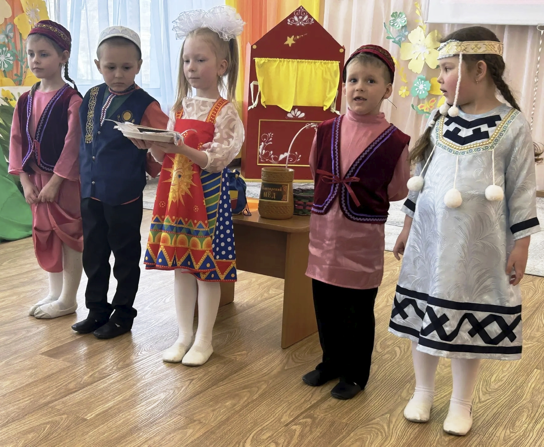 Юные артисты с большим энтузиазмом представили на сцене сказки разных народов России: сказки народов севера, русские народные, белорусские, ненецкие, башкирские. Была представлена авторская сказка про дружбу народов.