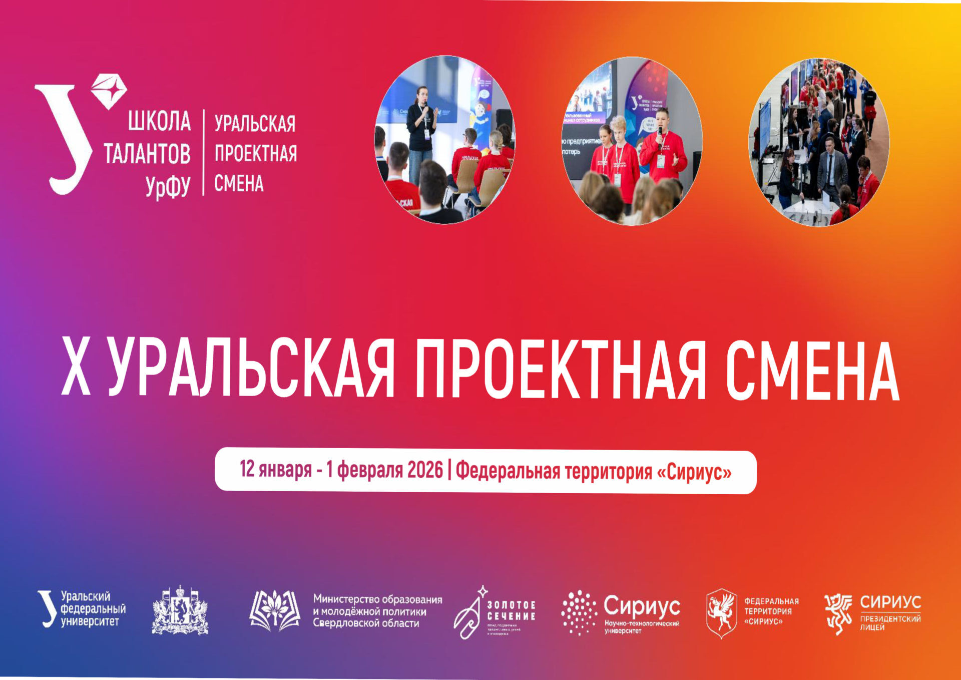 «Уральский федеральный университет имени первого Президента России Б. Н. Ельцина при поддержке Министерства образования и молодежной политики Свердловской области и Научно-технологического университета «Сириус» объявляет набор участников на X Уральскую проектную смену в Сириус (г.Сочи).